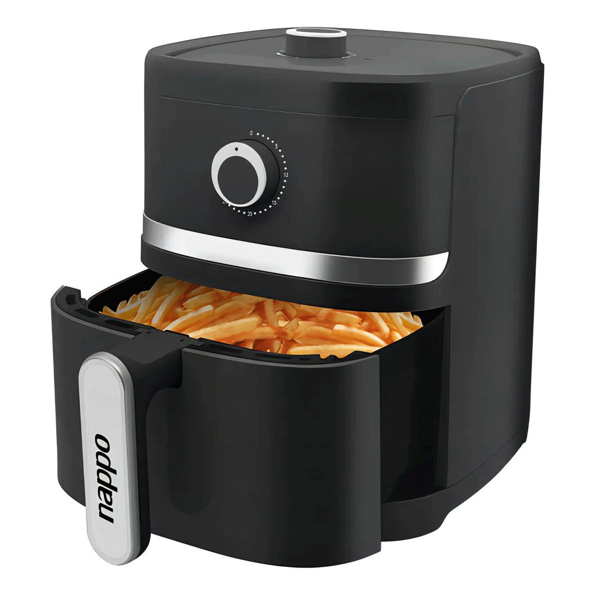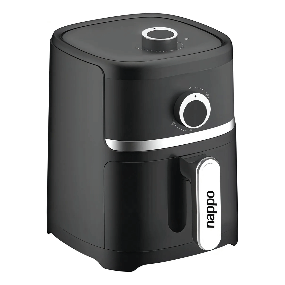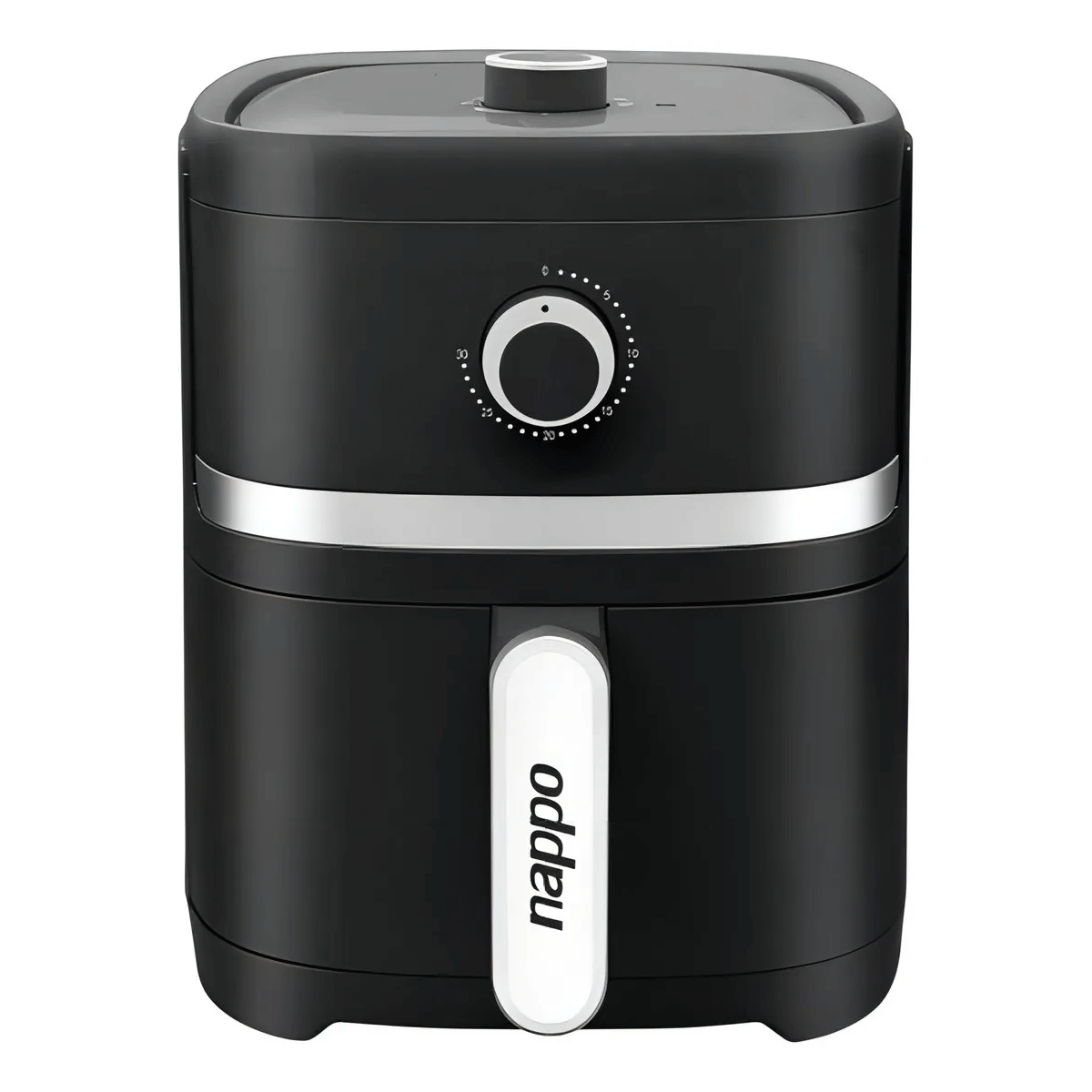 La freidora de aire Nappo NEF-131 es un electrodoméstico diseñado para cocinar alimentos de forma más saludable, utilizando circulación de aire caliente en alta velocidad para lograr cocciones crocantes sin necesidad de grandes cantidades de aceite. Su formato compacto la hace práctica para cocinas domésticas, permitiendo preparar desde papas fritas hasta carnes, vegetales y productos congelados.