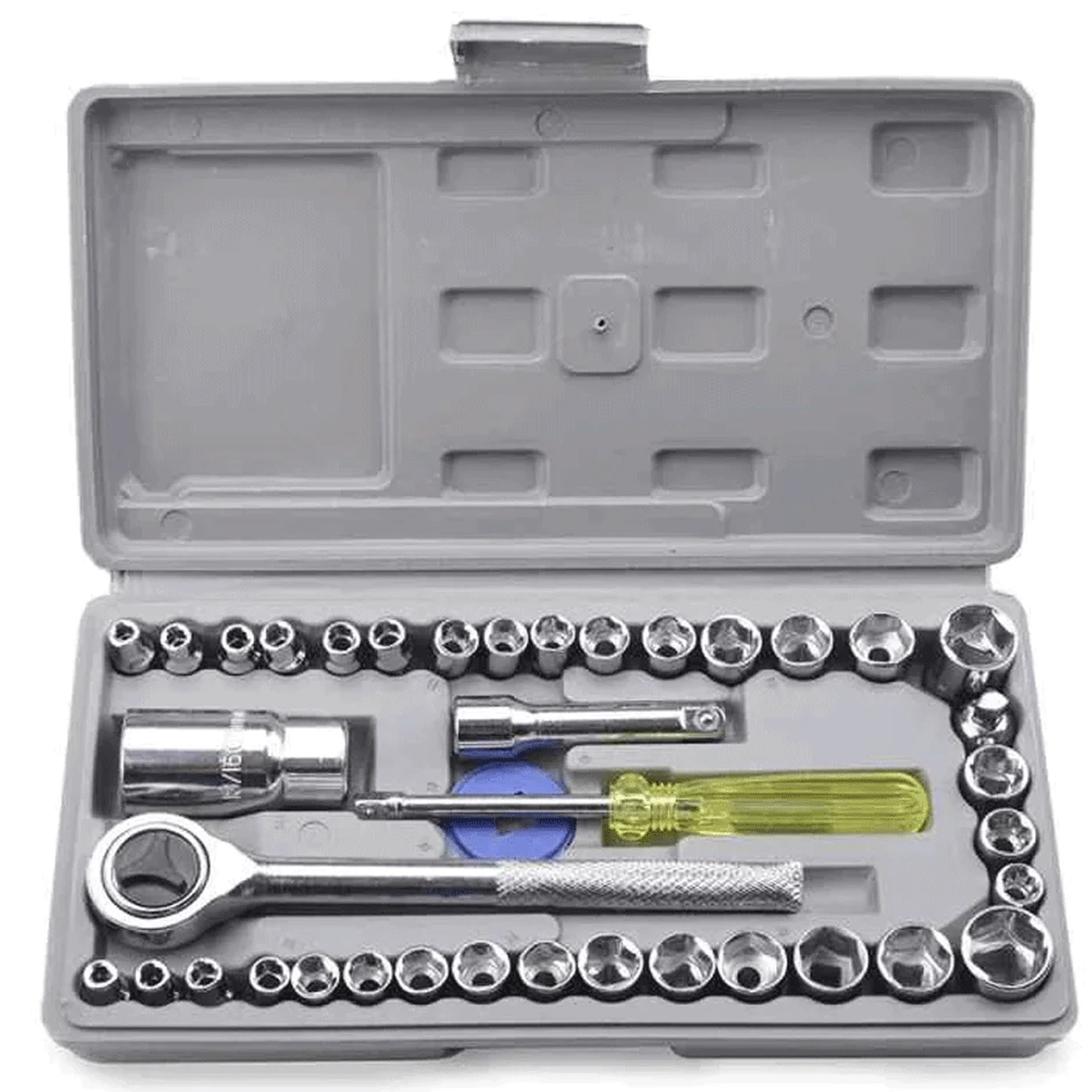 · Contenido: 1 llave cricket reversible de 3/8” (9.5mm). 1 mango giratorio de 6”.1 destornillador adaptable a dado.1 barra externsible de 3/8”.1 adaptador 1/4” x 3/8”. 14 dados métricos de 1/4” (4, 4.5, 5, 5.5, 6, 6.5, 7, 7.5, 8, 9, 10, 11, 12, 13 mm). 14 dados SAE -pulgadas- (5/32, 3/16, 7/32, 1/4, 9/32, 5/16, 11/32, 3/8, 13/32, 7/16, 15/32, 1/2, 17/32, 9/16”). 3 dados de 1/4” conector SAE 8pt (1/4, 5/16, 3/8”). 1 dado de 3/8” de bujía (21mm). 2 dados de 3/8” dados métricos -milímetros- (15mm, 16mm). Maletín plástico de transporte.