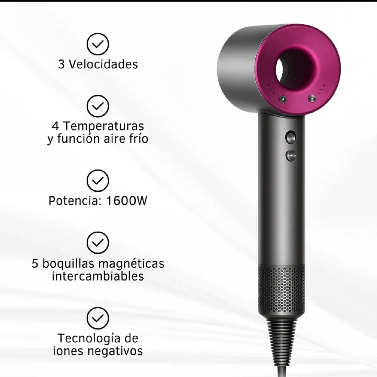 El set secador de pelo está diseñado para brindarte un secado rápido, eficiente y sin calor extremo. Con una potencia de 1600W y tecnología de alta velocidad, es ideal para lograr un peinado prolijo cuidando la salud del cabello.