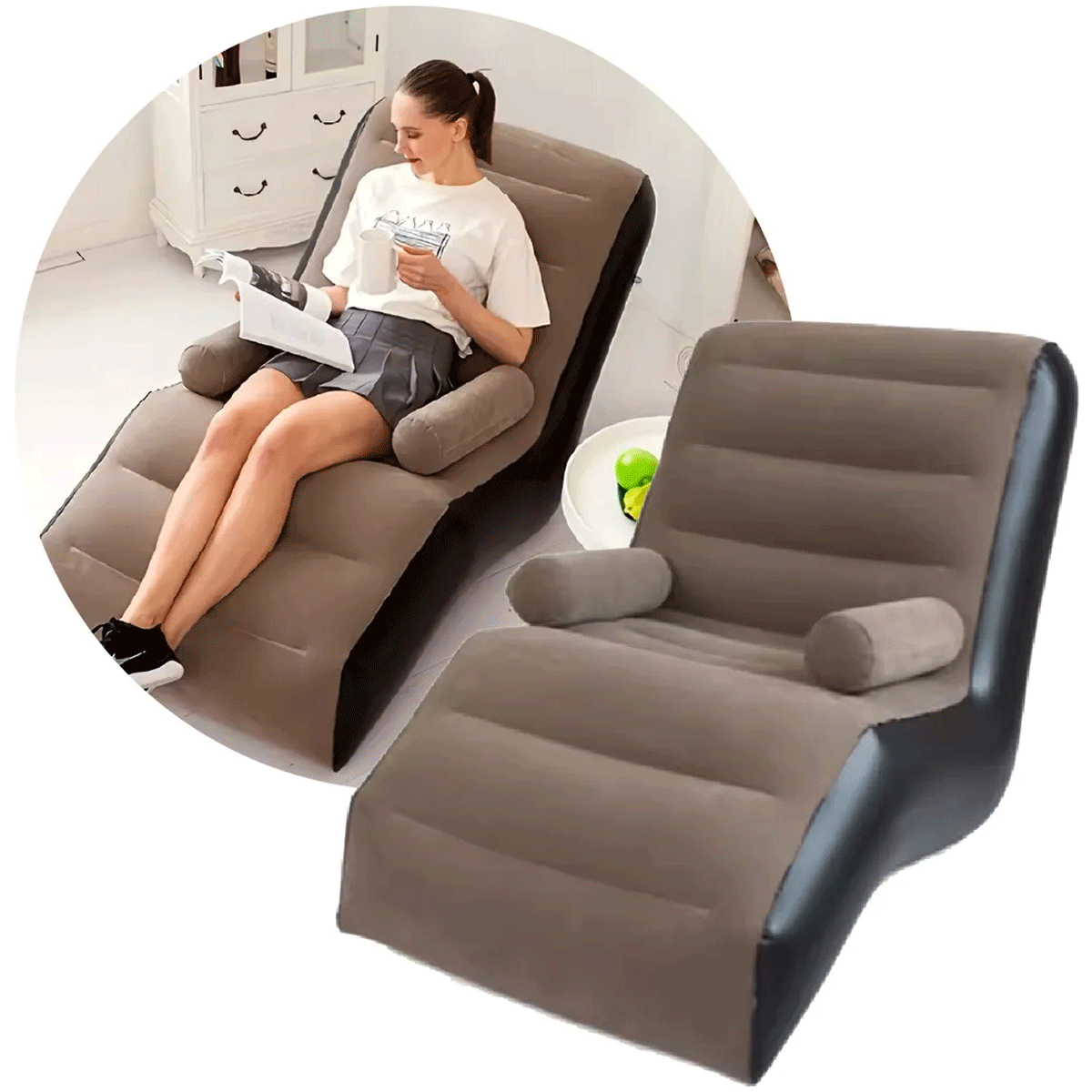 Este moderno y cómodo sillón inflable reclinable es la opción perfecta para quienes buscan relajación, estilo y practicidad. Su diseño ergonómico se adapta al cuerpo, brindando un soporte óptimo para la espalda y las piernas, ideal para leer, descansar, ver televisión o incluso tomar una siesta.