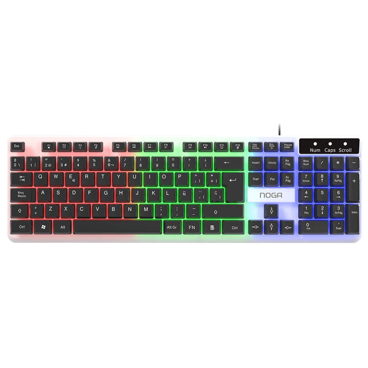 El teclado cuenta con 104 teclas en español, 12 teclas multimedia y retroiluminación efecto arco iris, con conexión USB que garantiza una respuesta estable. Su formato de 436 × 131 × 25 mm y cable de 1,4 m lo hacen práctico para el uso diario.