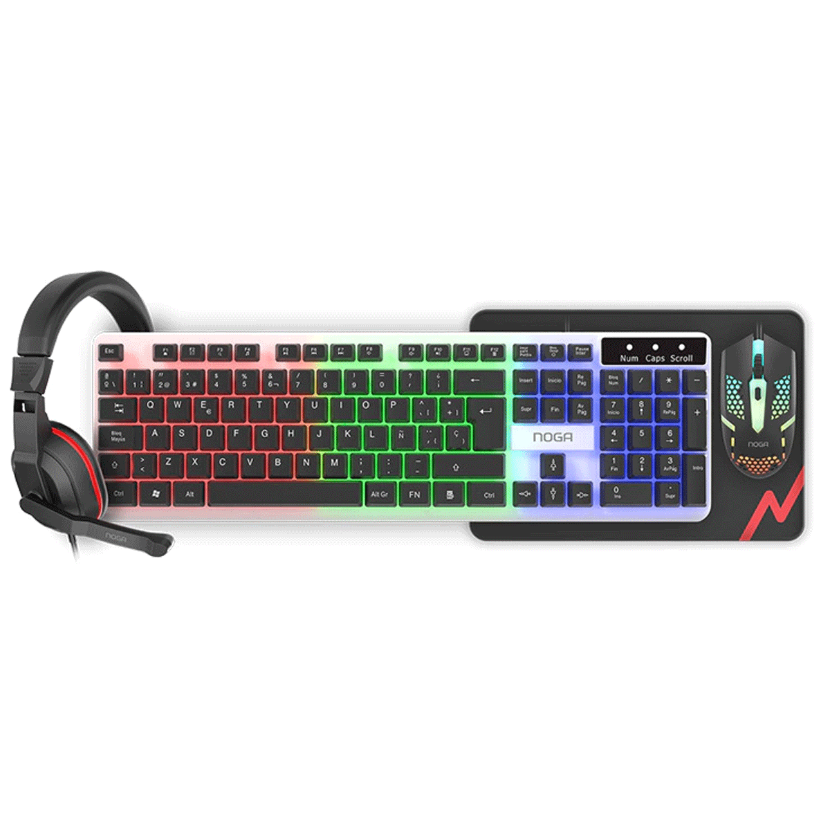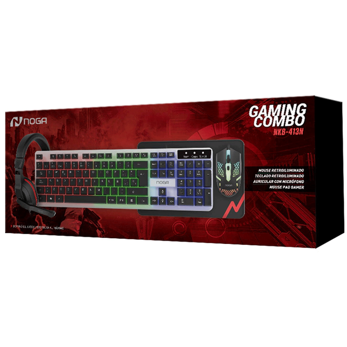El combo gamer Noga NKB-413 incluye teclado, mouse, auriculares y mouse pad, ofreciendo una solución completa para PC con estética gamer en color negro y retroiluminación integrada. Está diseñado para brindar comodidad y funcionalidad en un solo paquete.