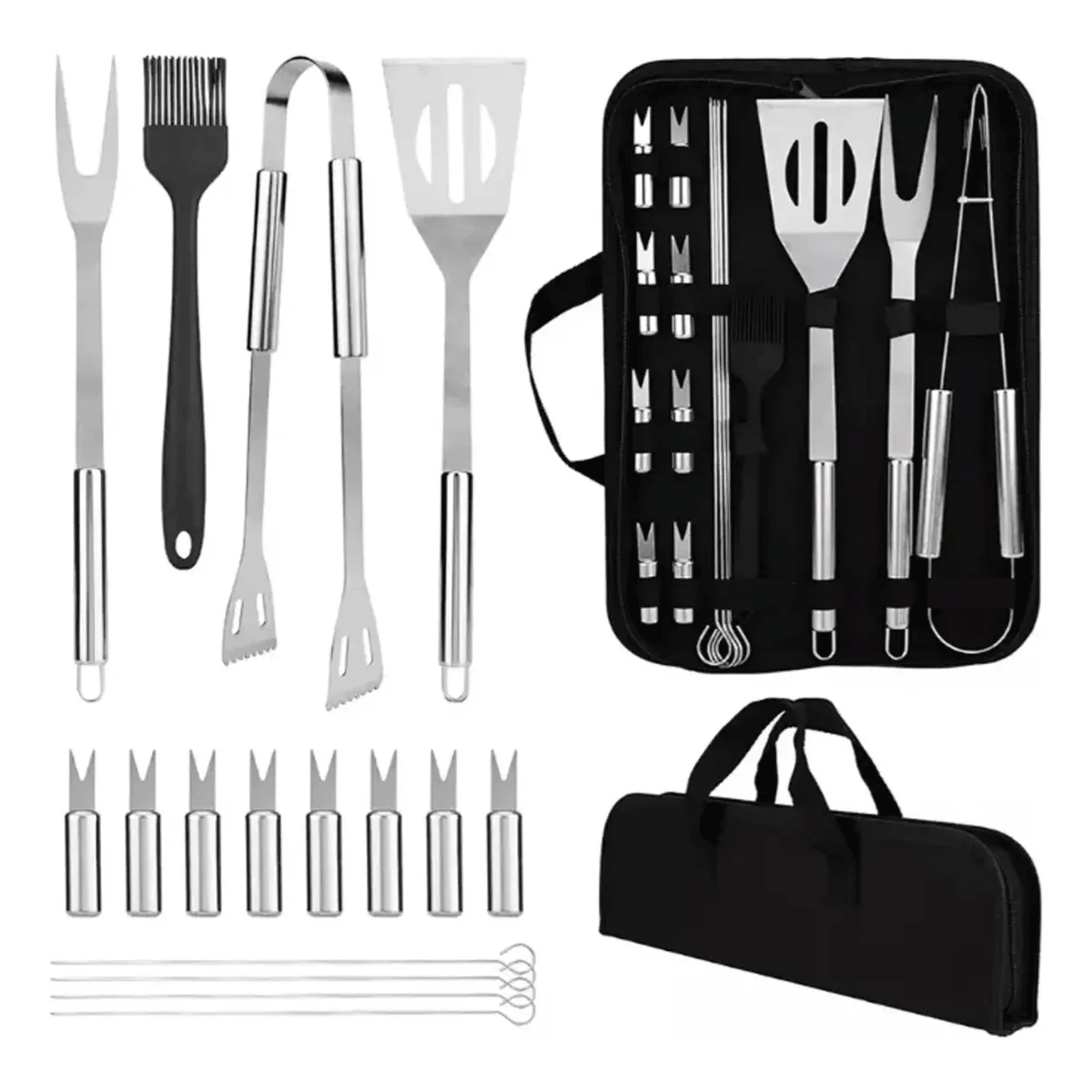 Incluye piezas como pinza, espátula, tenedor, brocha, brochetas y pinchos para choclo, permitiendo preparar distintos tipos de alimentos con precisión. Todos los accesorios se organizan en una funda con cierre y manijas para facilitar su transporte.